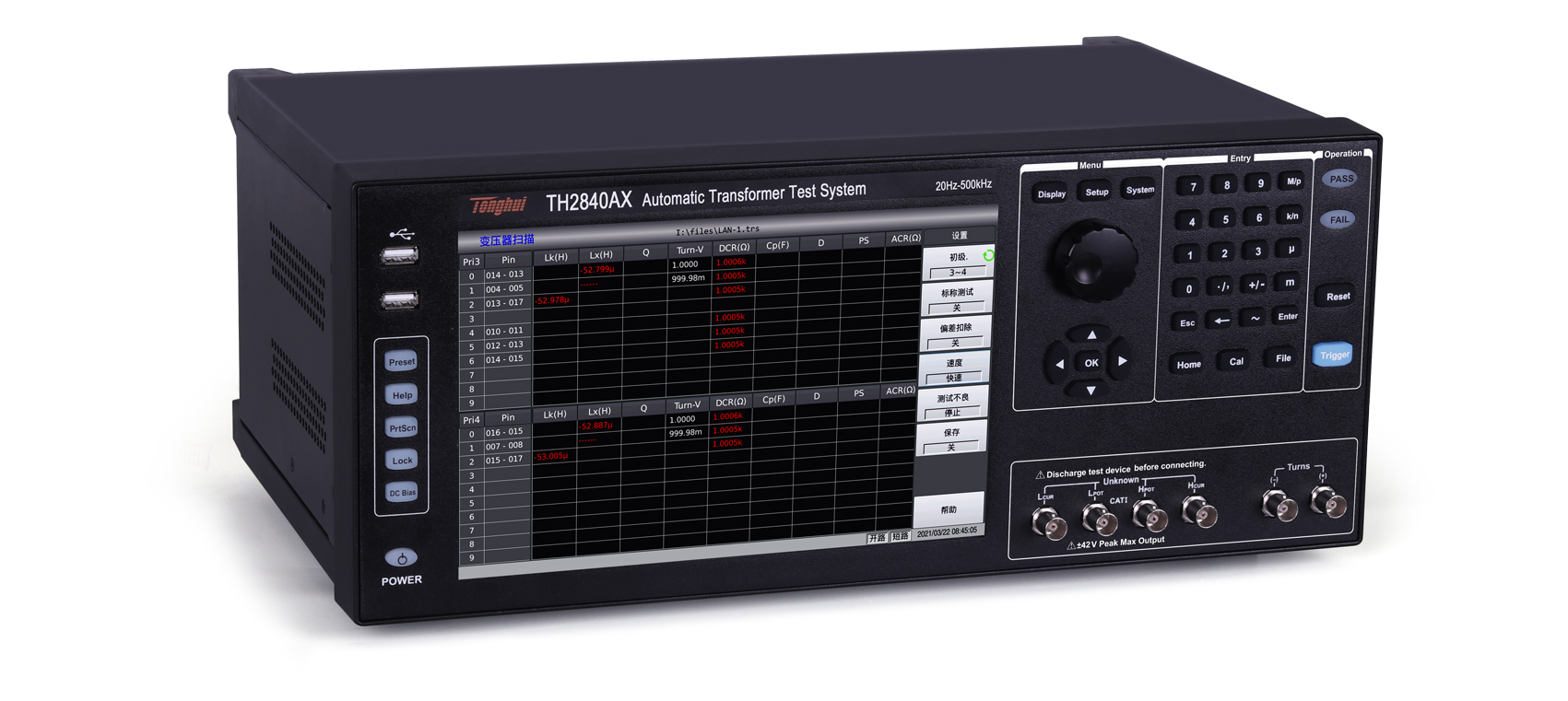 TH2840X系列自动变压器测试系统是常州同惠电子在多年变压器测试的经验上,采用了新一代技术成功的新一代自动变压器测试系统,创新性的采用了双CPU架构、Linux底层系统、10.1寸电容式触摸屏、中英文操作界面、内置使用说明及帮助等新一代技术,解决了以往测试系统设置繁琐、测试速度慢、显示不全、PIN脚位不足等缺陷。