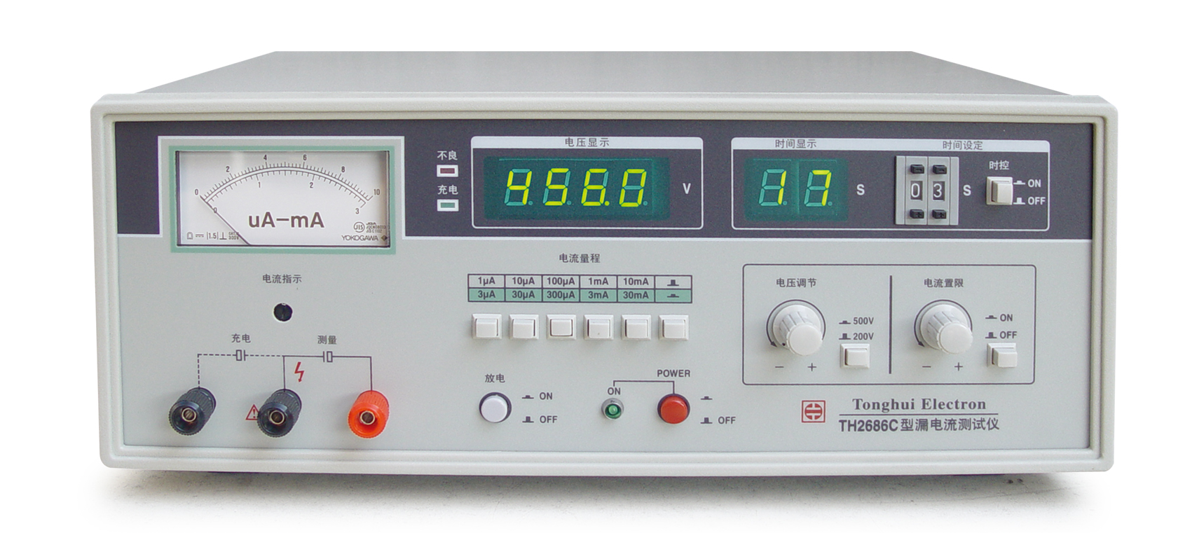 TH2686C型电解电容漏电流测试仪是一种能自动测量电解电容漏电流参数的测试仪器。测试电压连续可调。电压值、充电时间数字显示,电流值表针指示,充电—测试自动转换。具有电流超限指示,测试速度快,操作方便,安全可靠等特点。适用于生产线的质量保证及进货检验。