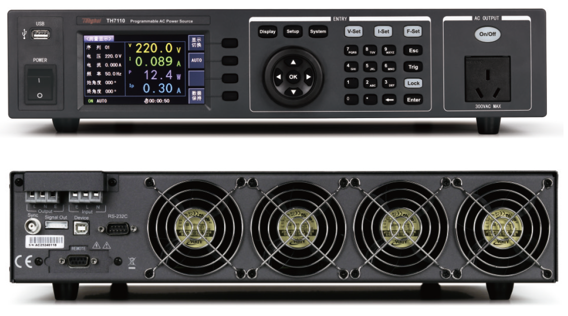 TH7100系列可编程交流电源配备了24位色4.3英寸的液晶显示屏,可同时显示电压(V)、电流(I)、功率(P)、峰值电流(AP)、峰值因素(CF)、功率因数(PF)等测量参数。此外,这款电源还具有超小体积,前后面板输出,安全保护功能完备、操作灵活方便等人性化的设计特点。
