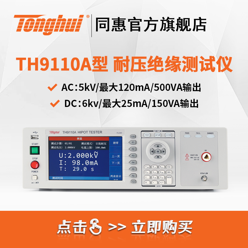 TH9110/TH9110A交直流耐压/绝缘电阻测试仪是同惠多年电气安规测试仪器设计的经验,设计的具有500VA大功率,最大输出交流5kV/100mA,符合大功率耐压测试需求,以及符合EN50191的设备要求。