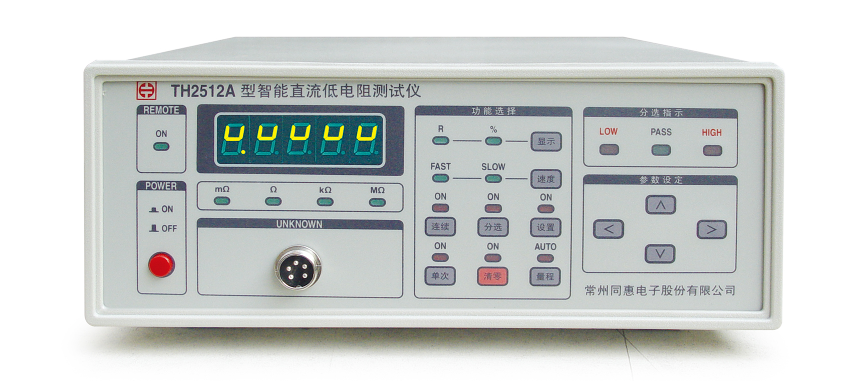 ■ TH2512A直流低电阻测试仪是智能化、宽范围、精密的直流电阻测试仪器,适用于变压器及电感线圈铜阻、继电器接触电阻、开关、接插件接触电阻、导线电阻、元件焊点接触电阻、印制板线条及焊孔电阻、金属探伤等。应用于生产线,可使用HANDLER接口及GPIB接口(选件)输出良品/不良品信号,以提高生产线自动化测试能力。